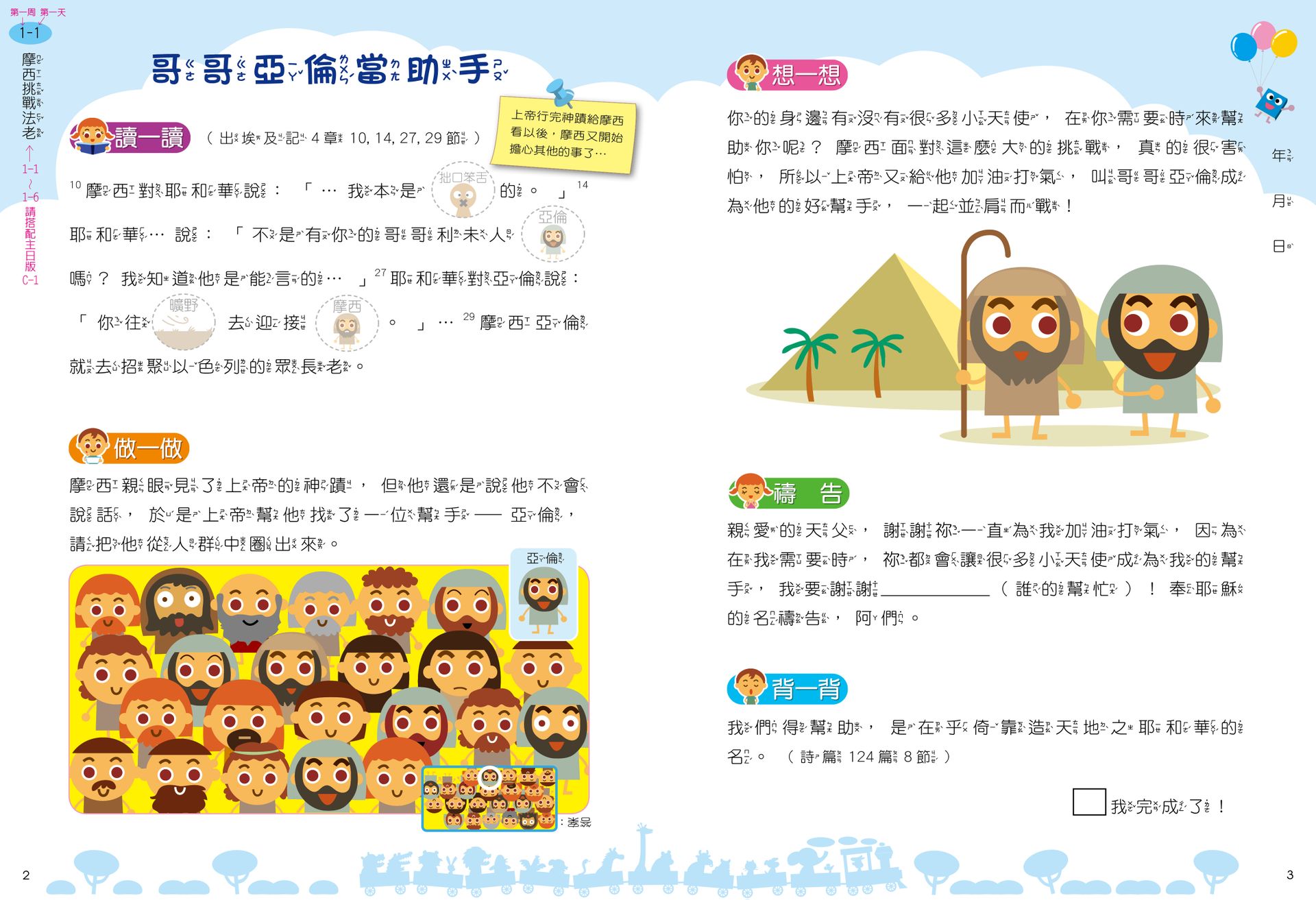 讀一讀:父母帶著孩子細讀一小段聖經,並在關鍵字貼上貼紙,增加印象。做一做:以繪圖、連連看、貼紙遊戲等,複習經文重點或含意。想一想:思考聖經含意,聯結孩子的生活經驗。背一背:背誦相關經文,印證上帝的應許。禱 告:禱告中與天父約定,把學習加入行動中。悄悄話:故事背景簡易說明或做相關的延伸,作為給家長的補充教學。