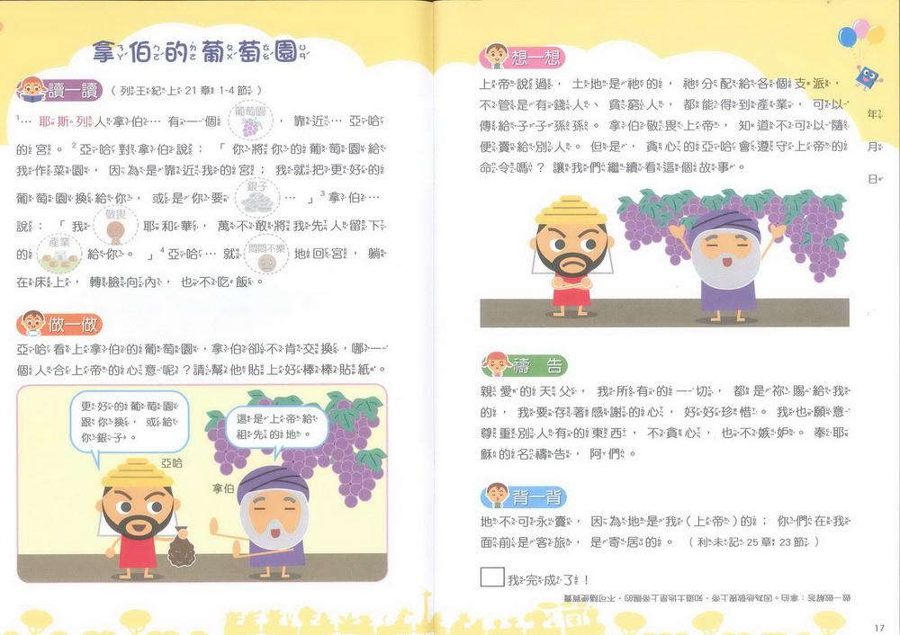 讀一讀:父母帶著孩子細讀一小段聖經,並在關鍵字貼上貼紙,增加印象。做一做:以繪圖、連連看、貼紙遊戲等,複習經文重點或含意。想一想:思考聖經含意,聯結孩子的生活經驗。背一背:背誦相關經文,印證上帝的應許。禱 告:禱告中與天父約定,把學習加入行動中。悄悄話:故事背景簡易說明或做相關的延伸,作為給家長的補充教學。