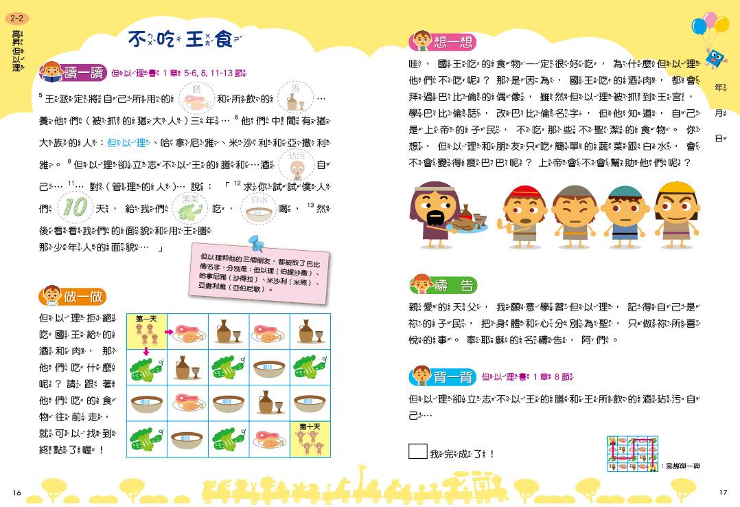 讀一讀:父母帶著孩子細讀一小段聖經,並在關鍵字貼上貼紙,增加印象。做一做:以繪圖、連連看、貼紙遊戲等,複習經文重點或含意。想一想:思考聖經含意,聯結孩子的生活經驗。背一背:背誦相關經文,印證上帝的應許。禱 告:禱告中與天父約定,把學習加入行動中。悄悄話:故事背景簡易說明或做相關的延伸,作為給家長的補充教學。
